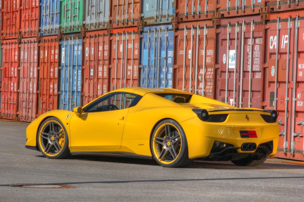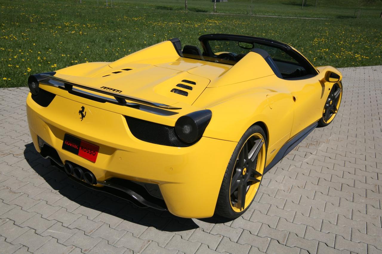La Ferrari ha dotato la 458 Spider di un body kit (in precedenza usato sulla coupé), che include un nuovo splitter anteriore, nuove minigonne, un diffusore posteriore e di un nuovo alettone posteriore completo. Il look è completato dalle luci posteriori fumè e il coperchio del motore rivestito in fibra di carbonio.I cerchi sono nuovi dei Novitec Rosso NF4 ultraleggeri da 21 pollici rivestite da uno piccolo strato di gomma delle Pirelli P-Zero. L’auto si trova anche 35 millimetri più bassa e ora dispone di idraulica regolabile in altezza, per superare cordoli e quei fastidiosi dossi anti velocità.