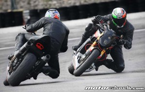 La Tuono è la versione scarenata dell’Aprilia RSV Mille, e vanta quindi con una base ciclistica da vera sportiva. La prima sensazione è quella di una moto agile, soprattutto nei cambi di direzione, molto gestibile nella frenata grazie al largo manubrio. I suoi habitat naturali sono: strade ricche di curve e piste medio veloci come Franciacorta, caratterizzate da una guida molto tecnica. Con le modifiche meccaniche apportate la moto è più veloce in uscita di curva, anche se troviamo un fastidioso on-off all’acceleratore che richiede maggiore sensibilità in fase di accelerazione e percorrenza. La sezione più generosa del pneumatico posteriore ha migliorato l’appoggio a terra incrementando la trazione. Per quanto riguarda l’inserimento in curva la moto scende in piega velocemente grazie al supporto della forcella Ohlins regolata dal proprietario in modo ottimale. Non si può dire altrettanto del mono per il quale sarebbe stata preferibile un’estensione più frenata. La mancanza di protezione aerodinamica penalizza il raggiungimento di velocità elevate, anche se si cerca di stare il più possibile “sdraiati” sul serbatoio. La posizione in sella nel guidato trae vantaggio da dei raiser non troppo alti che permettono in questo modo di poter caricare il peso sull’anteriore nonostante il manubrio largo. La posizione delle pedane anche se regolabili, è rimasta pressoché invariata rispetto alla configurazione originale, ma offre comunque un buon angolo in fase di piega.