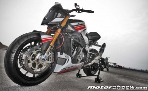 La base di partenza è un’Aprilia Tuono Racing del 2003 molto apprezzata per le sue qualità di guida e un po’ meno per quanto riguarda l‘estetica. Il raffinato pacchetto sospensioni Ohlins è composto da una forcella con foderi da 43mm e steli rovesciati, monoammortizzatore regolabile e ammortizzatore di sterzo. Il motore segue invece il classico schema bicilindrico Aprilia: posizione longitudinale con una V di 60 gradi, raffreddamento a liquido, 997,62 centimetri cubici di cilindrata con distribuzione bialbero a camme in testa e 4 valvole per cilindro. Le ruote sono OZ forgiate in alluminio con al posteriore un pneumatico da 190/55 rispetto al consueto 180. Invariata la misura anteriore da 120/70.