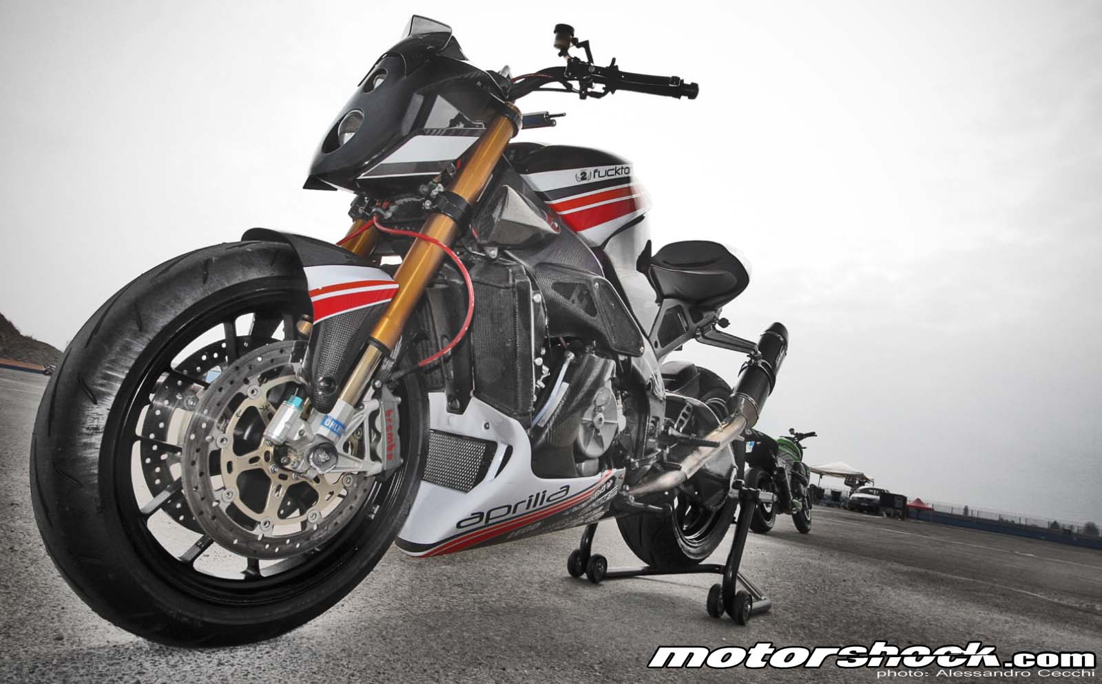 La moto è stata modificata principalmente nell’estetica con una colorazione aggressiva, molto carbonio e tanti interventi all’anteriore e sul codone, con un particolare occhio di riguardo ai dettagli. Per snellire la parte frontale è stato utilizzato un cupolino KTM Superduke R modificato ed integrato con due fari poliessoidali sovrapposti, presi in prestito da una Suzuki da endurance e da un BMW GS Adventure. La strumentazione AIM è stata inglobata in una struttura in vetroresina creata appositamente. Come per l’anteriore, anche la zona posteriore ha subito una profonda rivisitazione che ha permesso di snellire gli ingombri e slanciare la linea. La modifica prevede un ibrido composto da un telaietto proveniente da una Suzuki GSX-R e da un codone in vetroresina studiato per la Kawasaki ZX-10R del 2008. Gli unici componenti estetici rimasti originali sono il serbatoio, anche se dotato di tappo in ergal a sgancio rapido, ed il puntale in carbonio, optional Aprilia. Il parafango anteriore è stato modificato solo in piccola parte per renderlo simile a quello usato nelle gare di endurance al fine di consentire la rapida sostituzione del pneumatico. Come accennato, la ciclistica è di primo equipaggiamento ma per problemi di spazio dovuti al nuovo cupolino, l’ammortizzatore di sterzo ha abbandonato l’usuale posizione tra le due piastre di sterzo riposizionandosi sopra al manubrio grazie all’utilizzo di un supporto artigianale ricavato dal pieno. Per la meccanica è stato sostituito l’impianto di scarico singolo con collettori Akrapovic 2 in 2 e terminali Sc-Project con eprom SBK Aprilia Racing. L’aspirazione è migliorata con l’ausilio di un filtro aria BMC più poroso, mentre per la rapportatura troviamo un pignone da 16 al posto del 17. Nella parte anteriore dell’impianto frenante sono state sostituite le già ottime pinze originali Brembo biblocco ad attacco radiale, con un elemento monoblocco M4 ancora più performante, pompa radiale sempre Brembo 19×20, tubi in treccia Frentubo e freno posteriore Brembo P2 34. E’ stata sostituita anche la pompa frizione con una Brembo 16×18.